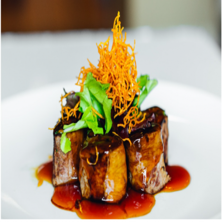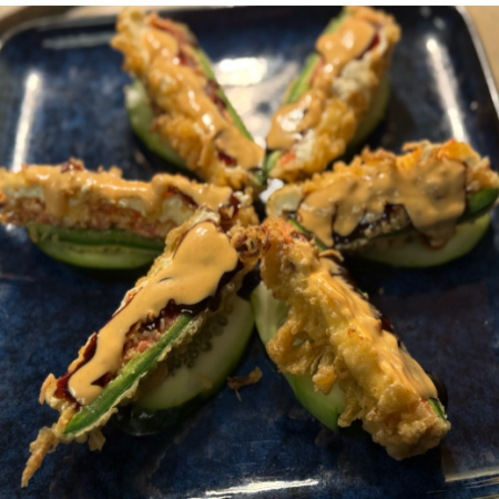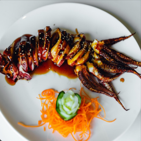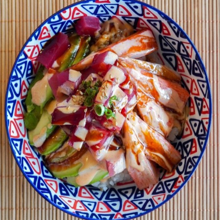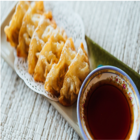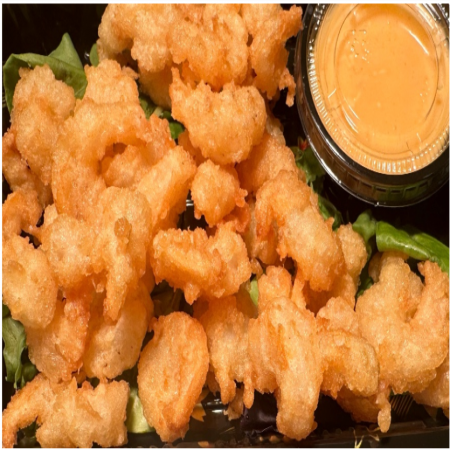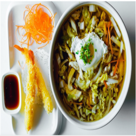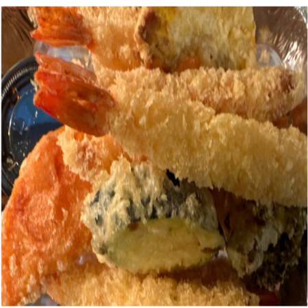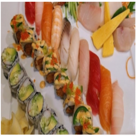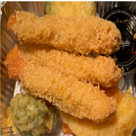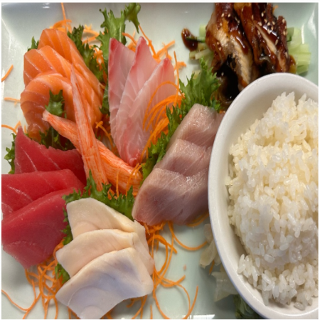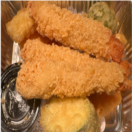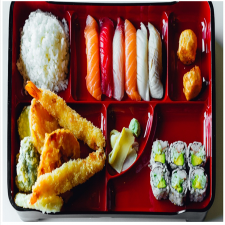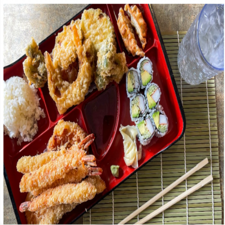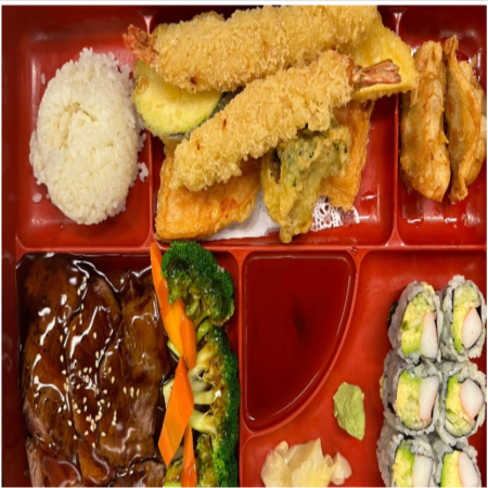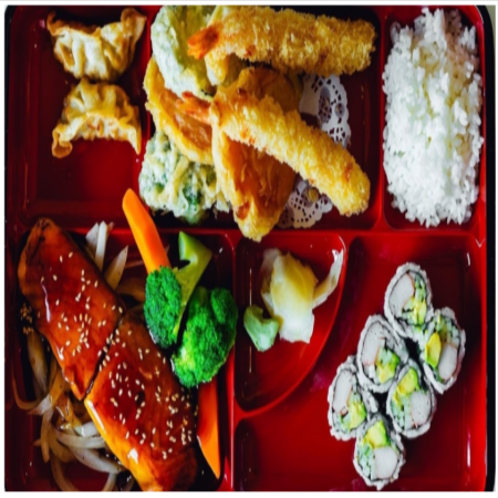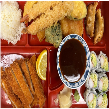 Includes California Roll, two (2) pieces of Fried Pork Dumplings, two (2) pieces of Tempura Shrimp and five (5) pieces of tempura Vegetable. Served with Miso or Mushroom Soup, house salad and white rice.