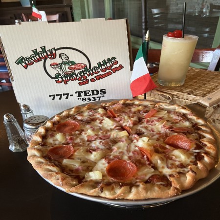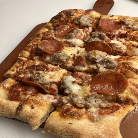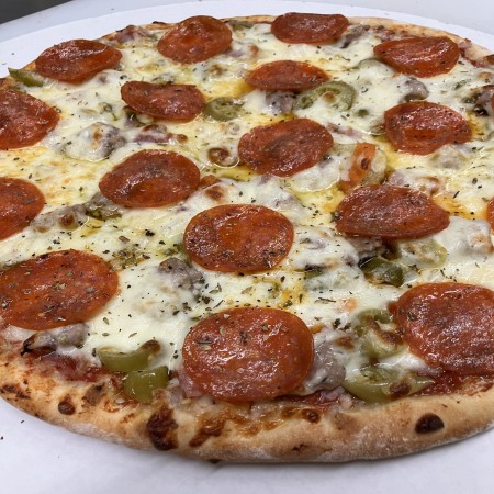 Traditional thin crust pizza with cheese and your choice of toppings